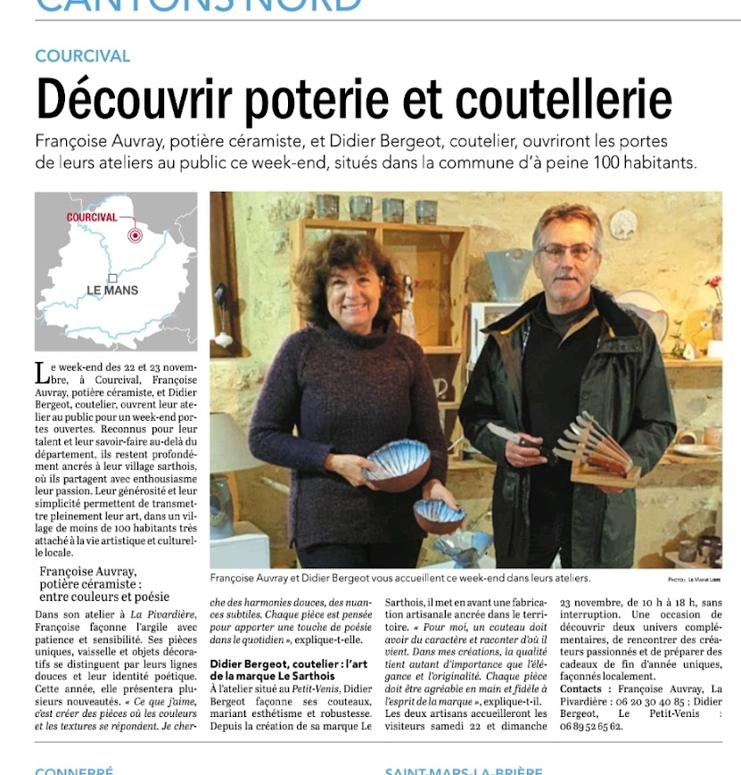 J'exprime ma plus vive reconnaissance et sympathie à toutes les personnes venues me rencontrer lors de mes déplacements pour Noël mais aussi à l'atelier. Un grand merci également aux correspondants de presse et aux offices de tourisme Balade en Maine Saosnois . Je vais prendre un peu de repos et profiter de ma famille. Je vous souhaite un joyeux Noël