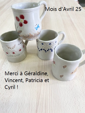 Vos œuvres seront alors disponibles dans un délai minimum d’un mois, temps nécessaire et indispensable au séchage et aux cuissons. L’art de la céramique ou « l’art de la patience », vous pourrez à ce moment là les récupérer sur RDV à l’atelier ou les recevoir par voie postale moyennant un supplément pour les frais d’expédition de 15 € , attention ; si votre tasse n'est pas récupérée au bout de 6 mois, la tasse sera donnée à une association .